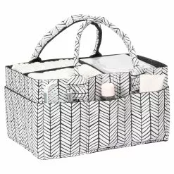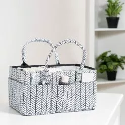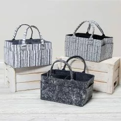 Storage organizers available in a soft sturdy felt will become an everyday essential item for any new parent. Storage caddy is sectioned and designed to keep diapers, wipes and changing items organized. With sturdy felt handles, the storage can be easily moved from room to room. Keep clutter out of sight, or collapse the caddy when not in use.