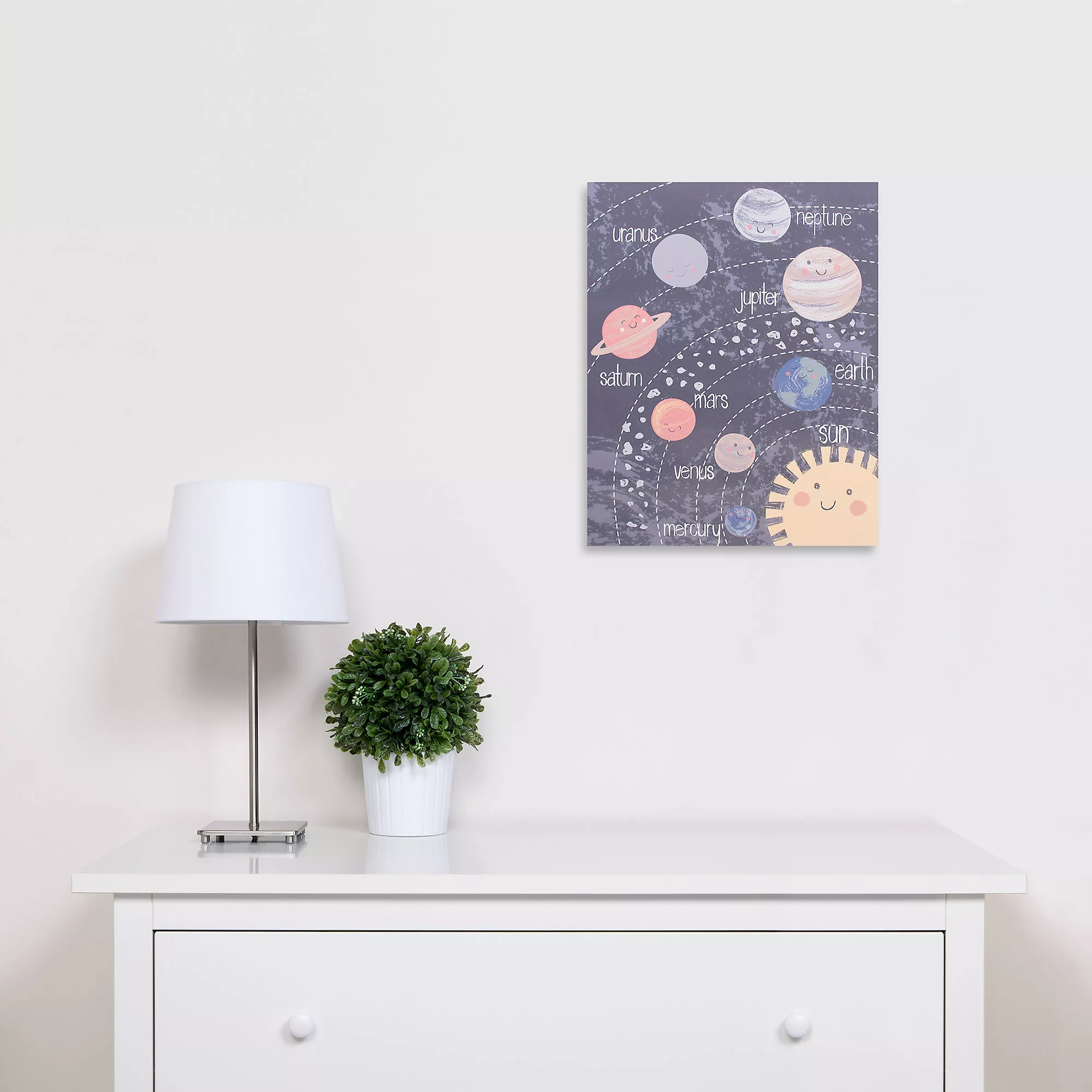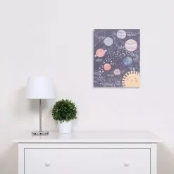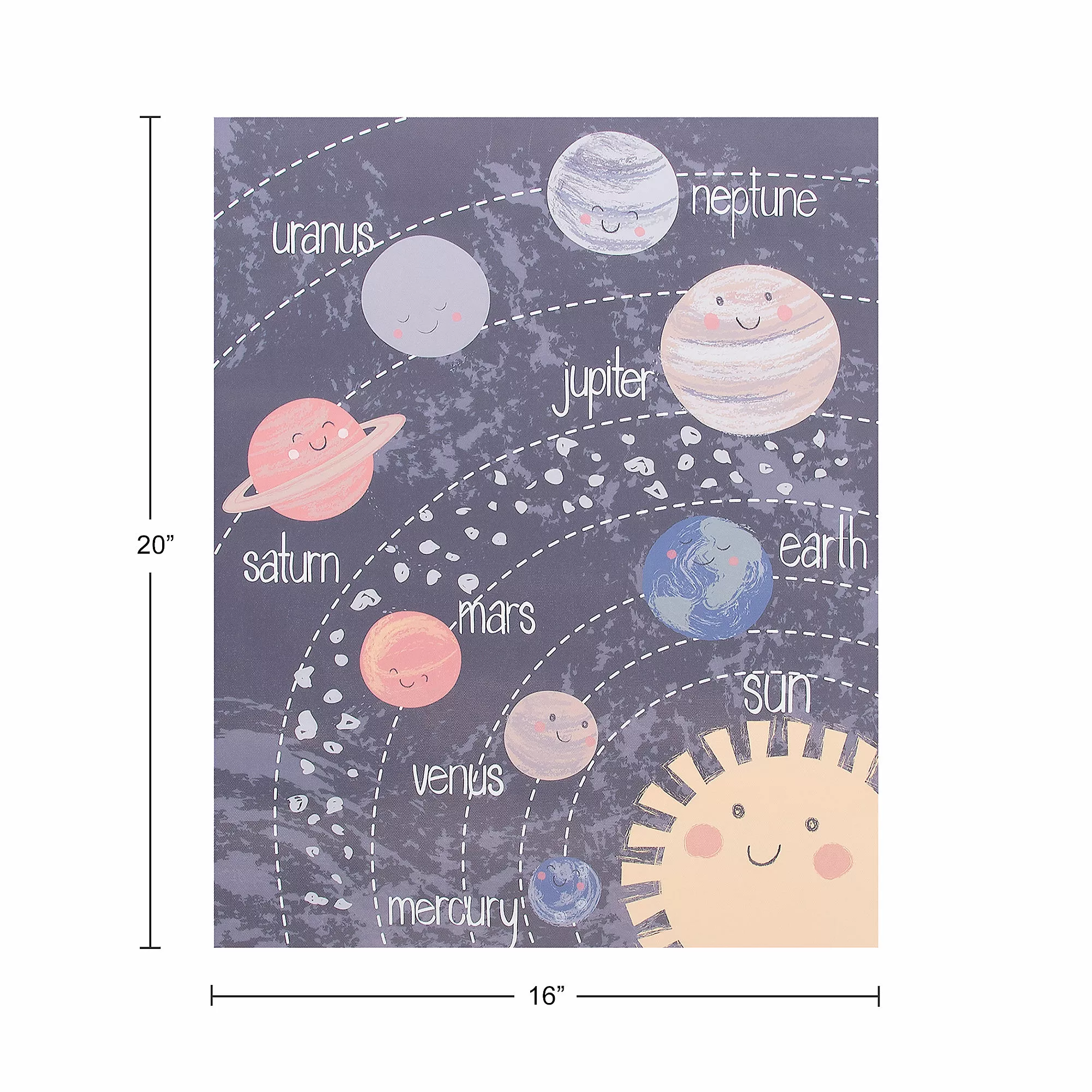 Complete the look of your baby’s room with the Outer Space Canvas Wall Art that includes a playful take on the solar system printed on a navy background. Canvas measures 16 in x 20 in and mounting hardware is attached to the back for easy hanging. Wall art coordinates with the Sammy & Lou® Outer Space nursery collection.