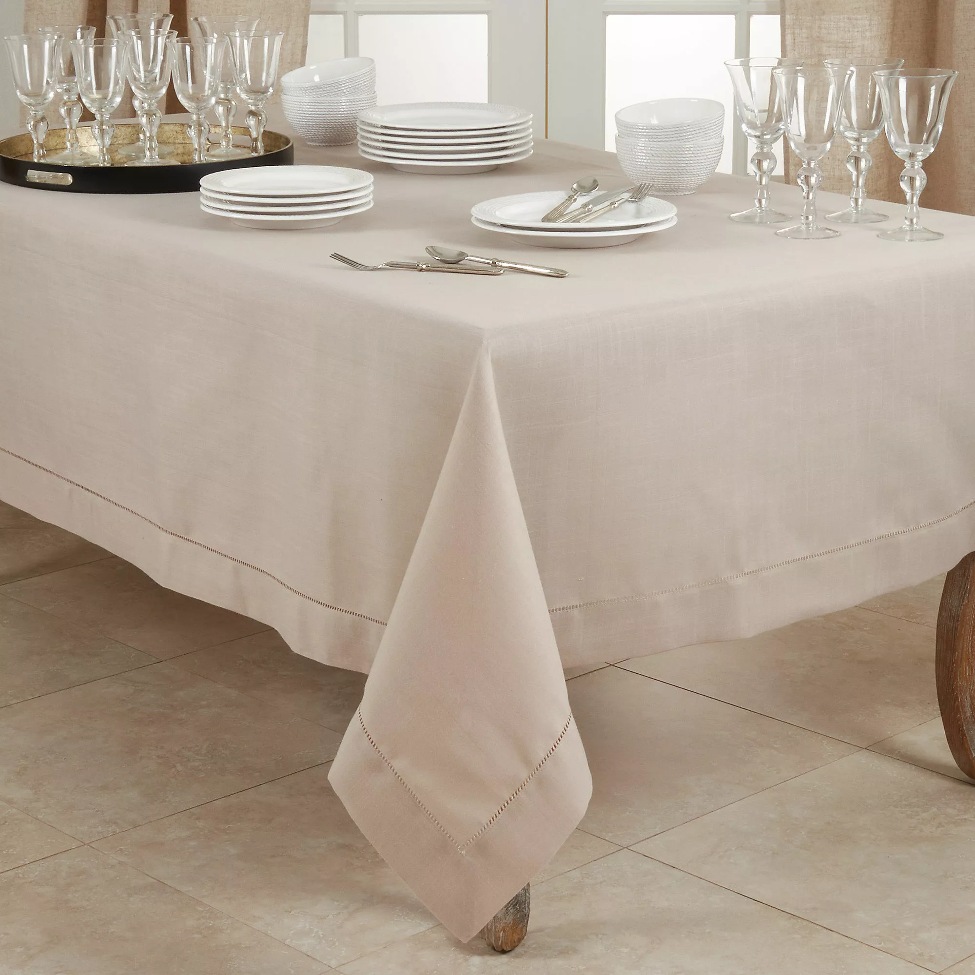 This elegant Hemstitched Tablecloth is available in a variety of classic solid colors to keep your table timeless and classic but also versatile. Keep it casual for everyday use or dress up for formal dining and take your tablescape to the next level.