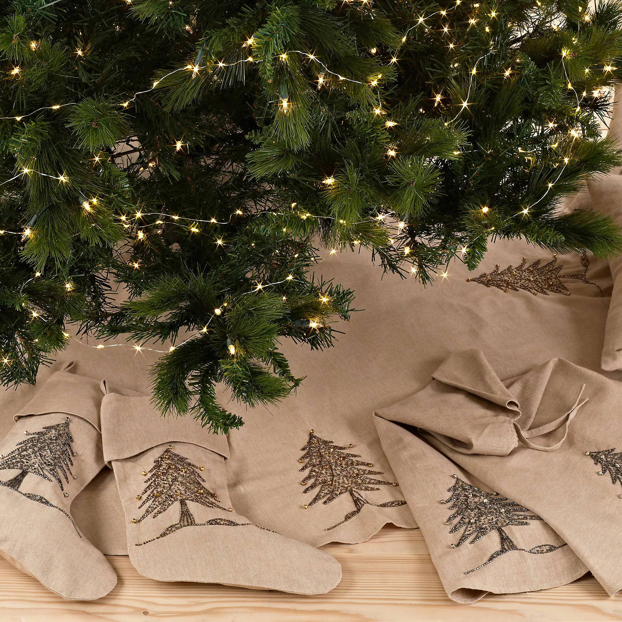 Give your Christmas décor the perfect finishing touch with this unique Beaded Christmas Tree Design Tree Skirt. Not only does it provide your tree with a gorgeous foundation, but it also helps protect floors from fallen pine needles. It features a natural background, which makes it easy to fit within any decor.