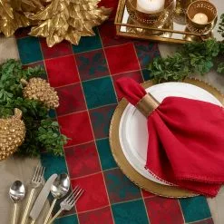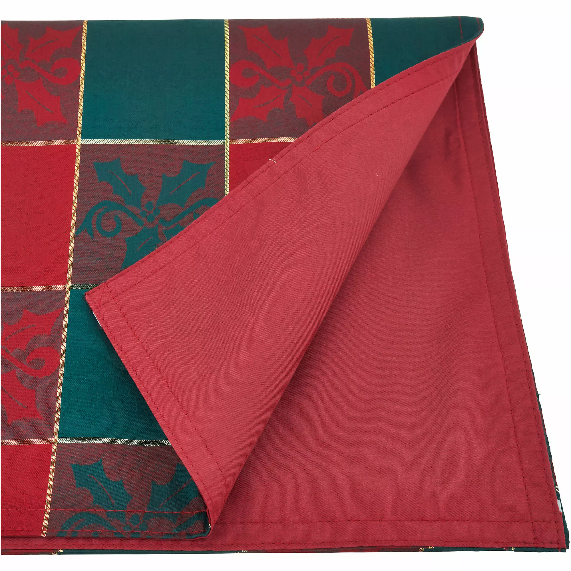 Create a stunning holiday table with this beautiful plaid tablecloth. Featuring a woven holly design against a classic plaid with a subtle woven gold detail that pairs beautifully with gold decor accents. Complete with the matching napkins for a coordinated look or keep it simple and mix with solid colors.