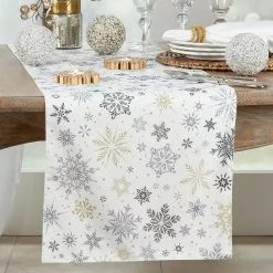 Featuring multiple sizes and shapes of falling snowflakes, this stylish and winter-inspired Snowflakes Design Table Runner adds a textured look and feel to your holiday table. It’s the ideal backdrop for any meal with a lovely combination of white, blue and gold tones. Complete your table with solid color linens and decor accents for a cohesive look.