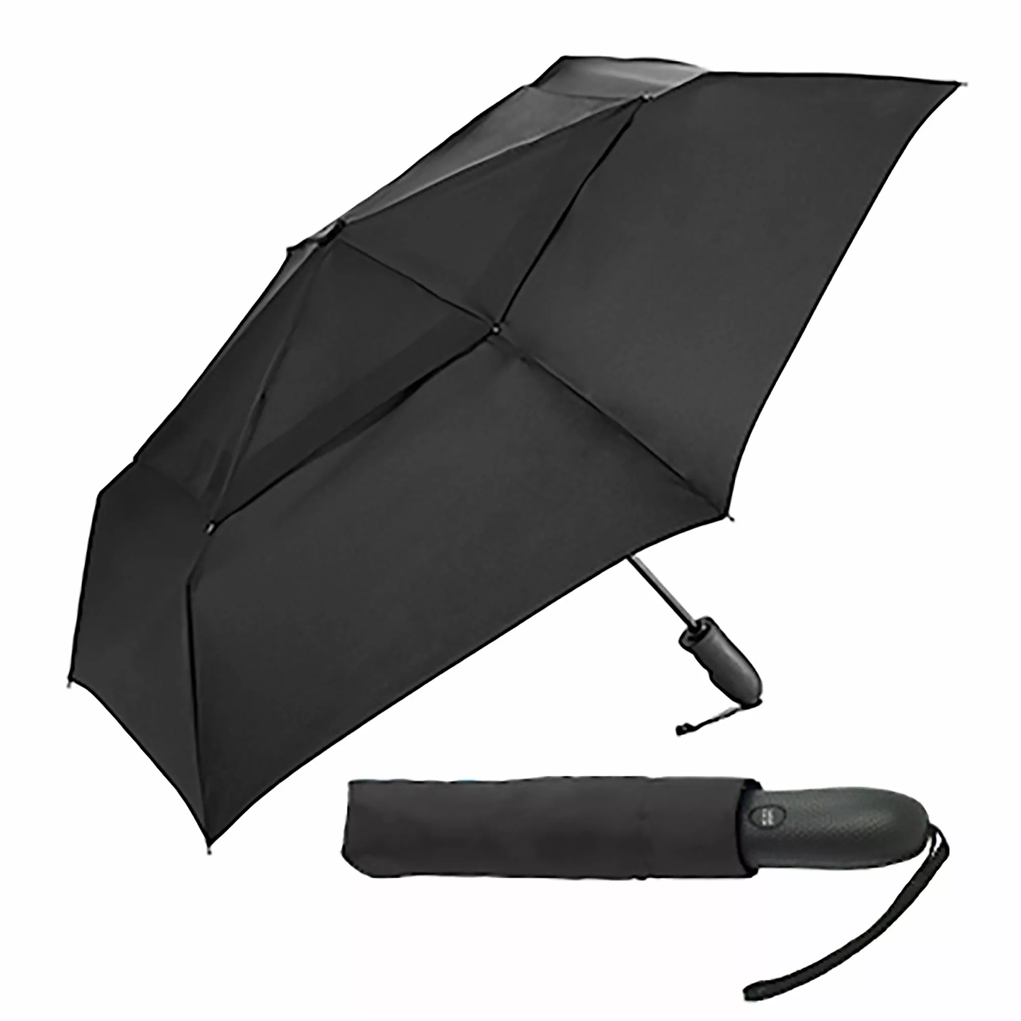 43″ arc, 3 section saft, automatic open and close. Vented canopy – engineered to resist windy conditions. Black steel shaft and FRP ribs. Ergonomic rubber grip handle. Woven wrist strap and self fabric case.