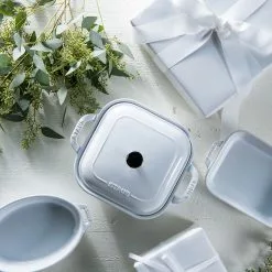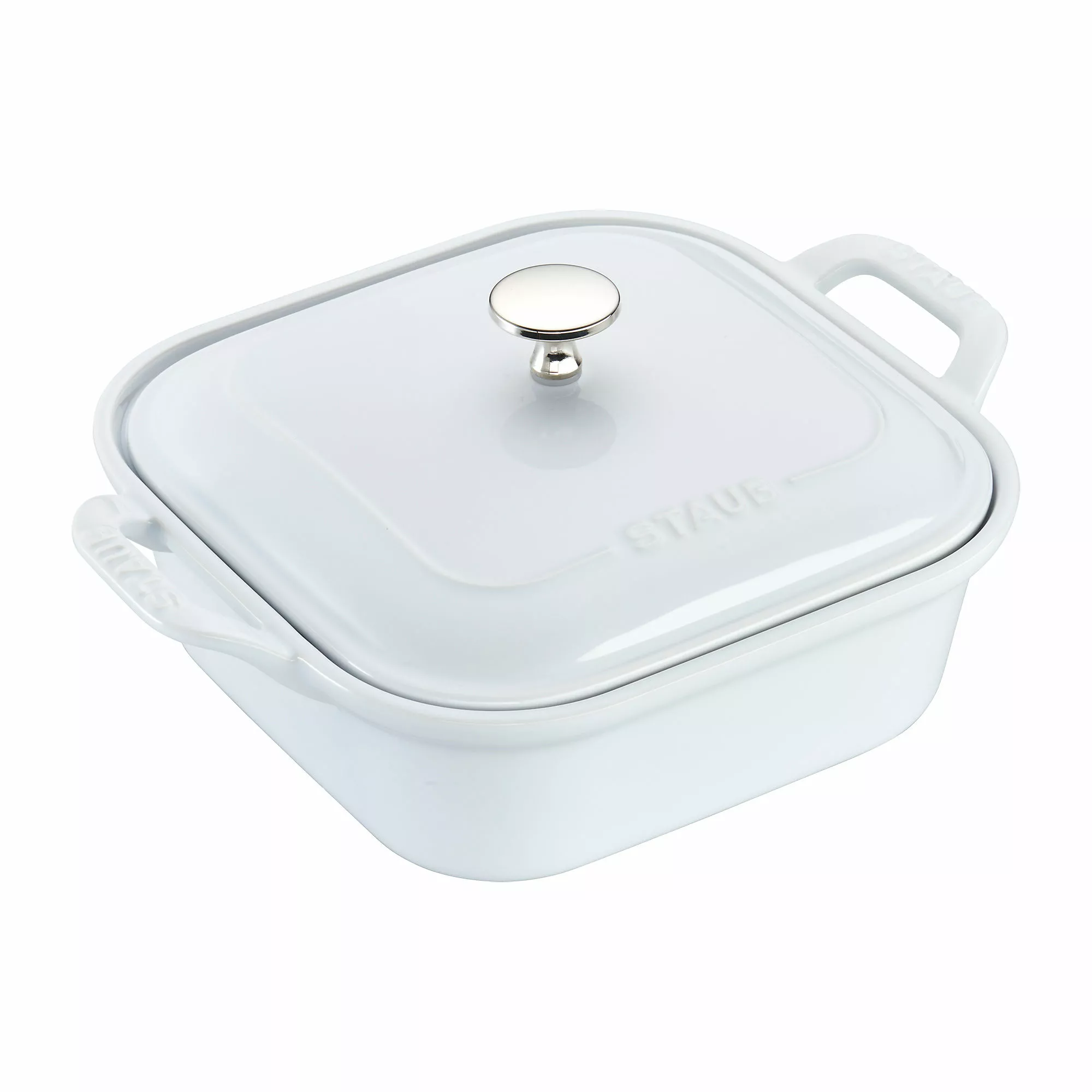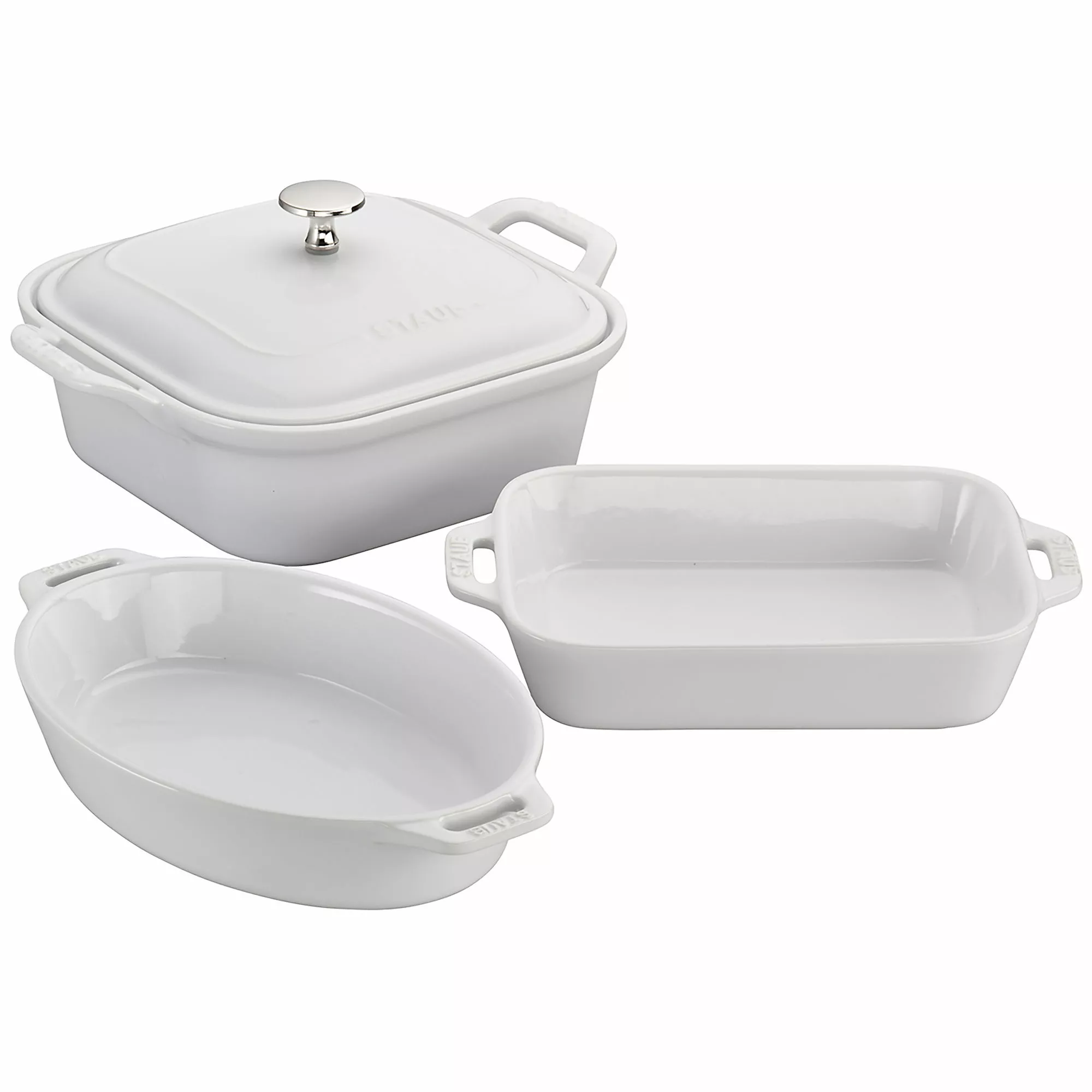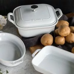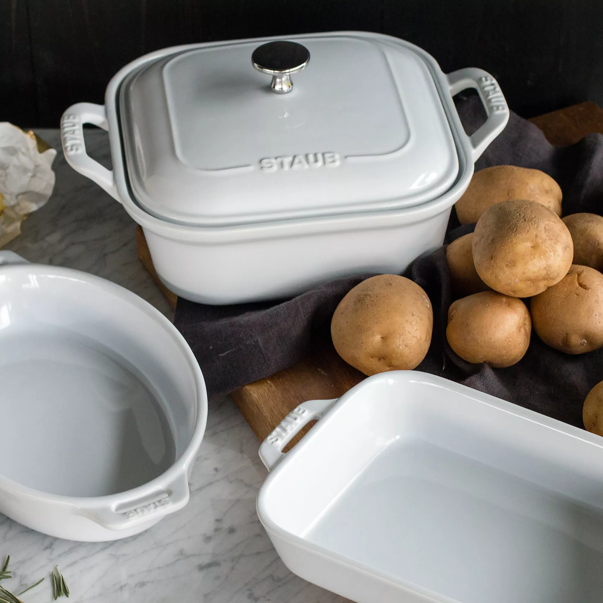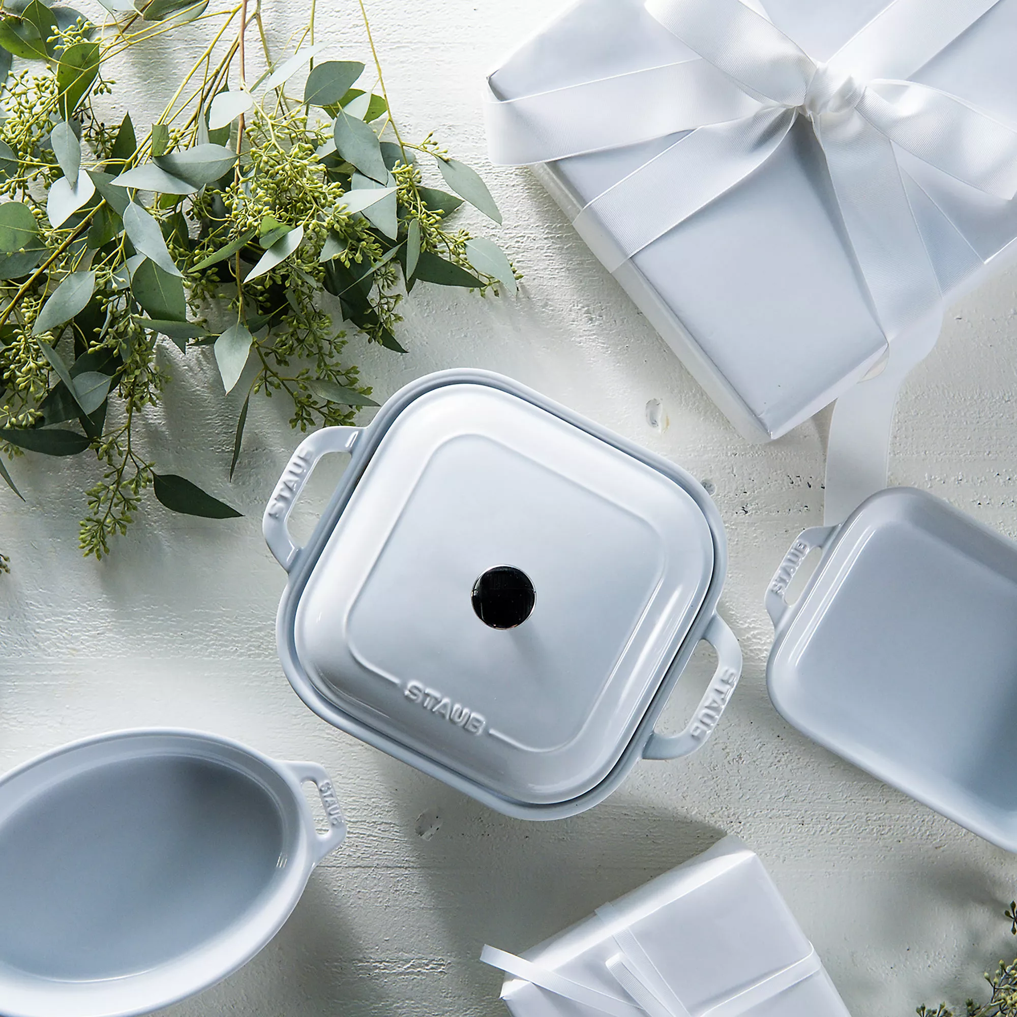 Rooted in French culinary heritage, Staub is beloved by professional and home chefs for its exquisite craftsmanship, exceptional performance, and timeless beauty. The new Staub Ceramic 4 Piece Set is the secret to savory casseroles and delicious desserts. The porcelain enamel glaze prevents absorption of moisture during baking, so foods won’t dry out. Enjoy gooey mac n’ cheese, buttery apple crumble, and moist brownies every time. The set is conveniently stocked with three different sizes and shapes. Thanks to their chic, classic design, each versatile piece easily transitions from the oven to the table. The 9″x 9″ Square Covered Baker allows you to bake and serve in the same dish – plus, its lid locks in heat to keep your food warm. Equally beautiful and durable, the bakeware is extremely resistant to impact and thermal shock. Its gorgeous vitreous glass porcelain enamel finish puts a pop of color in your kitchen.Â