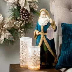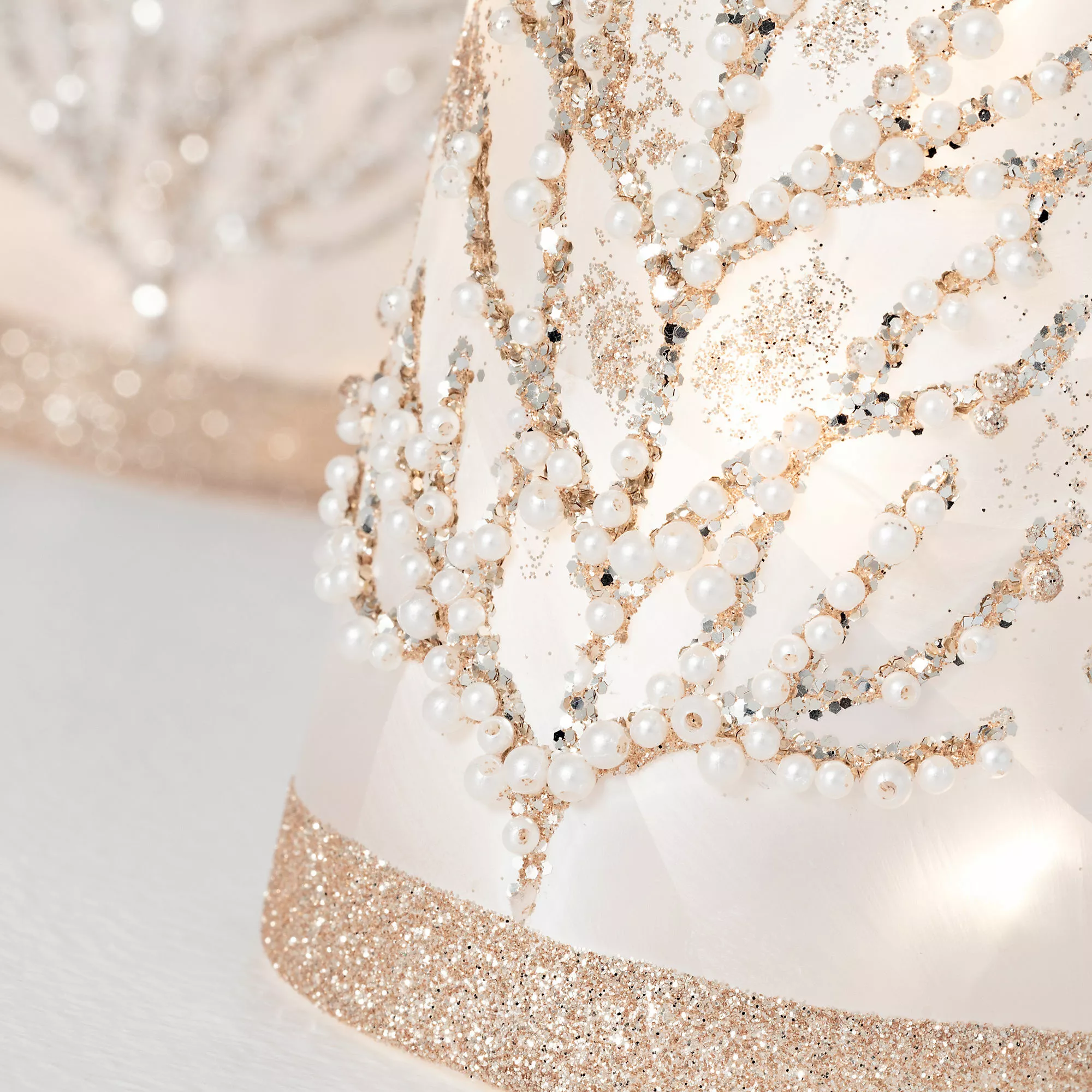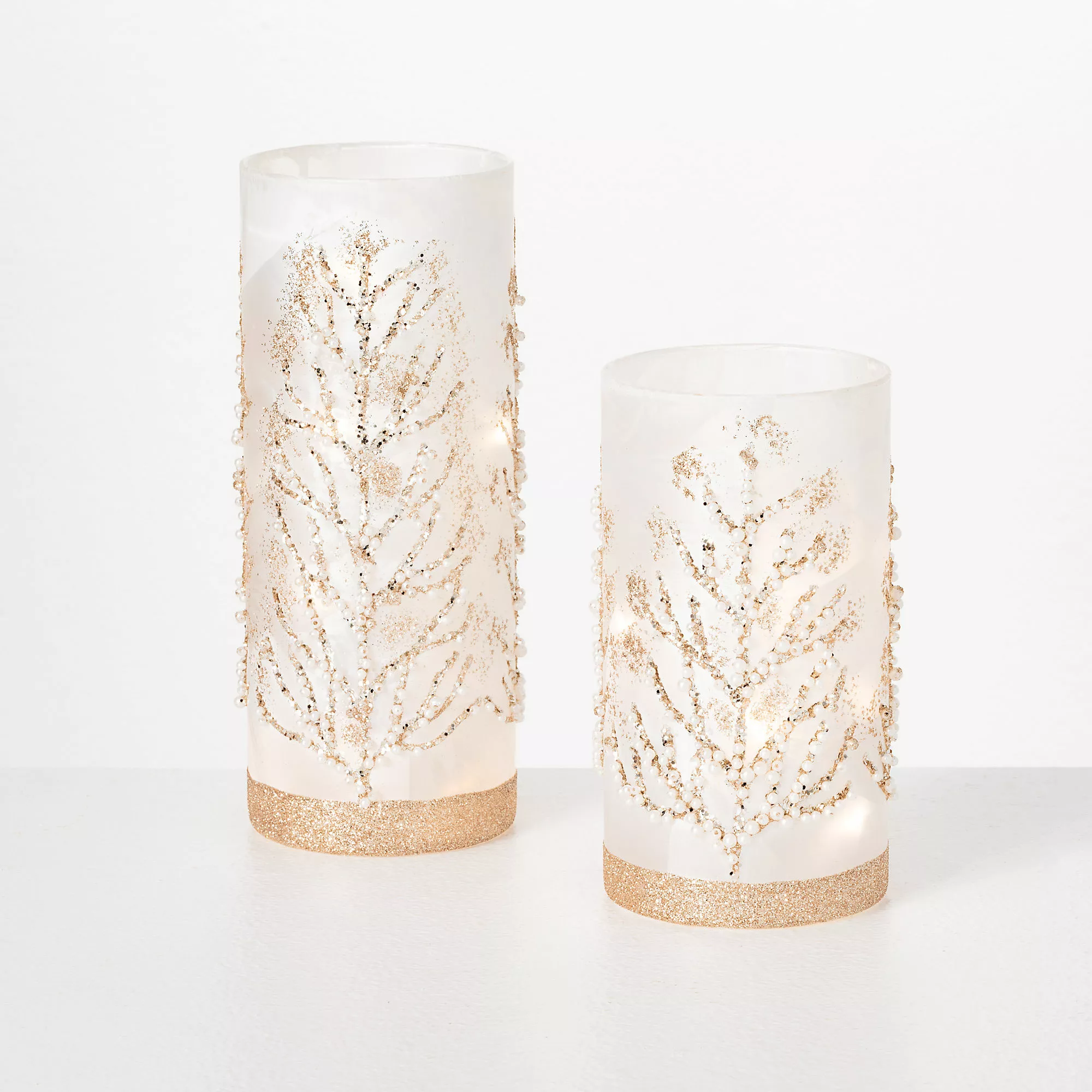This set of two lighted Christmas cylinders will add a warm glow to your Holiday decor. Embellished with glitter and pearls, these 6 and 8 inch cylinders are sure to elevate your space.