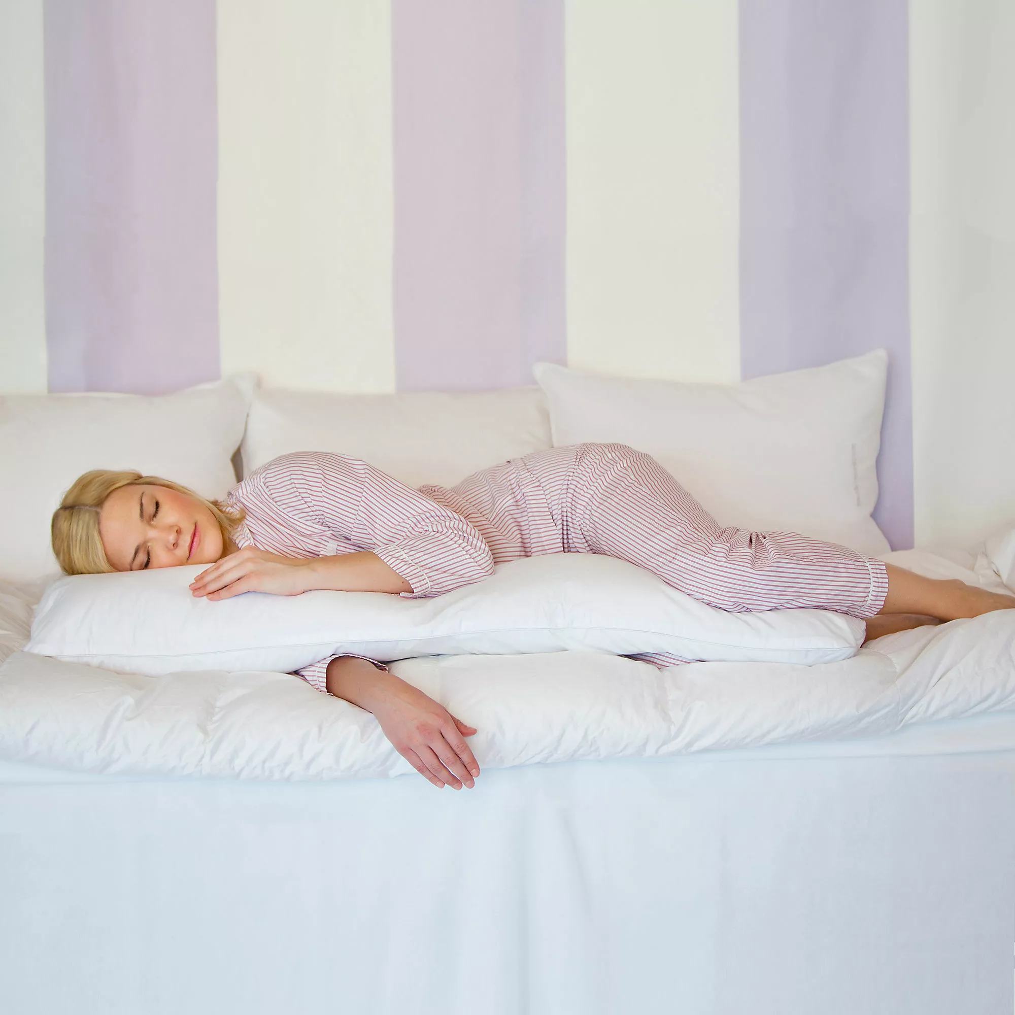 Slumberliciousâ„¢ Body Pillow provides ultimate support for the neck and shoulders as well as hips and lower back. Each pillow is hand made for you in Texas, USA. The Pillow Bar’s Down Alternative fill contains a proprietary blend of combed polyester fiber designed to mimic the luxurious density and loft of naturally-sourced down. Includes a removable 300 thread count washable cotton sateen zippered protector.