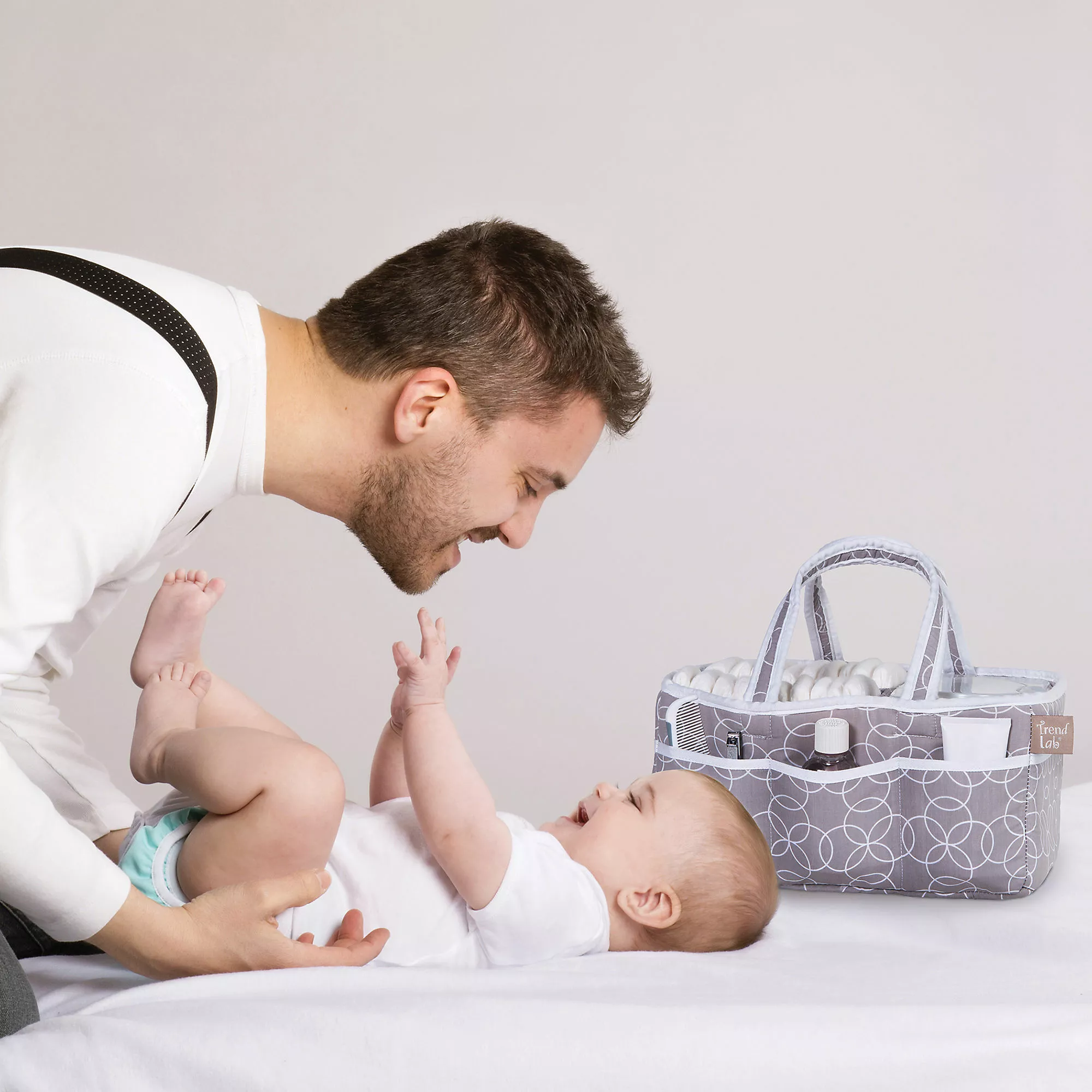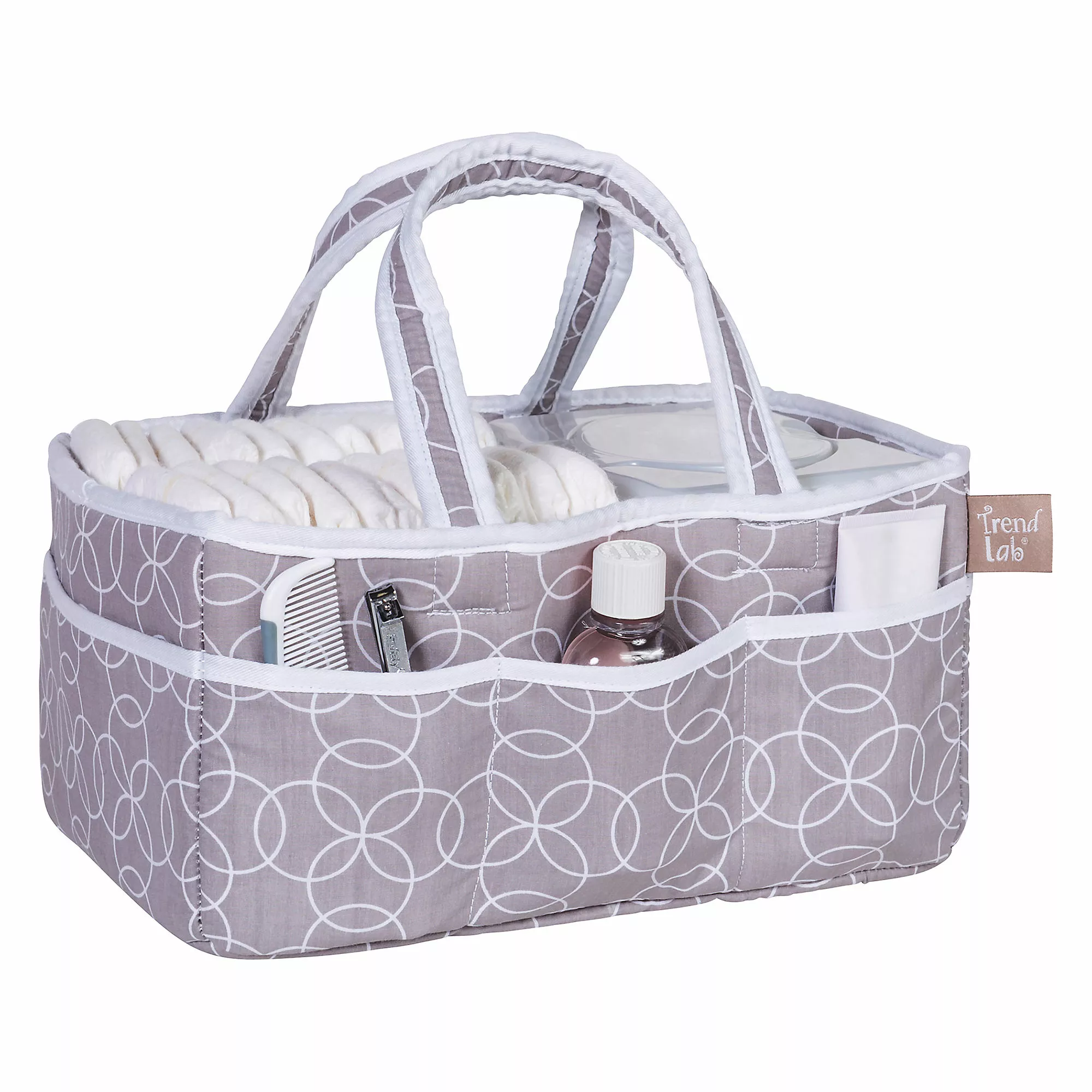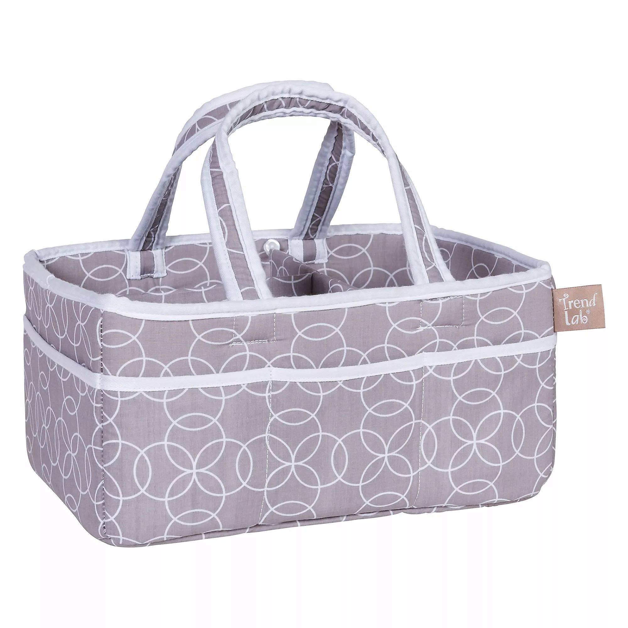 Add organization to any area of your home with this Circles Gray portable Storage Caddy by Trend Lab. This lightly padded caddy features an opal gray and white geometric circle print with a crisp white trim. Caddy has 8 outer pockets and a removable “T” separator for maximum versatility. Keep diapers, wipes and other necessities tidy while traveling from room to room. Caddy also functions as an organizer for crafts, picnics, pet supplies, etc.