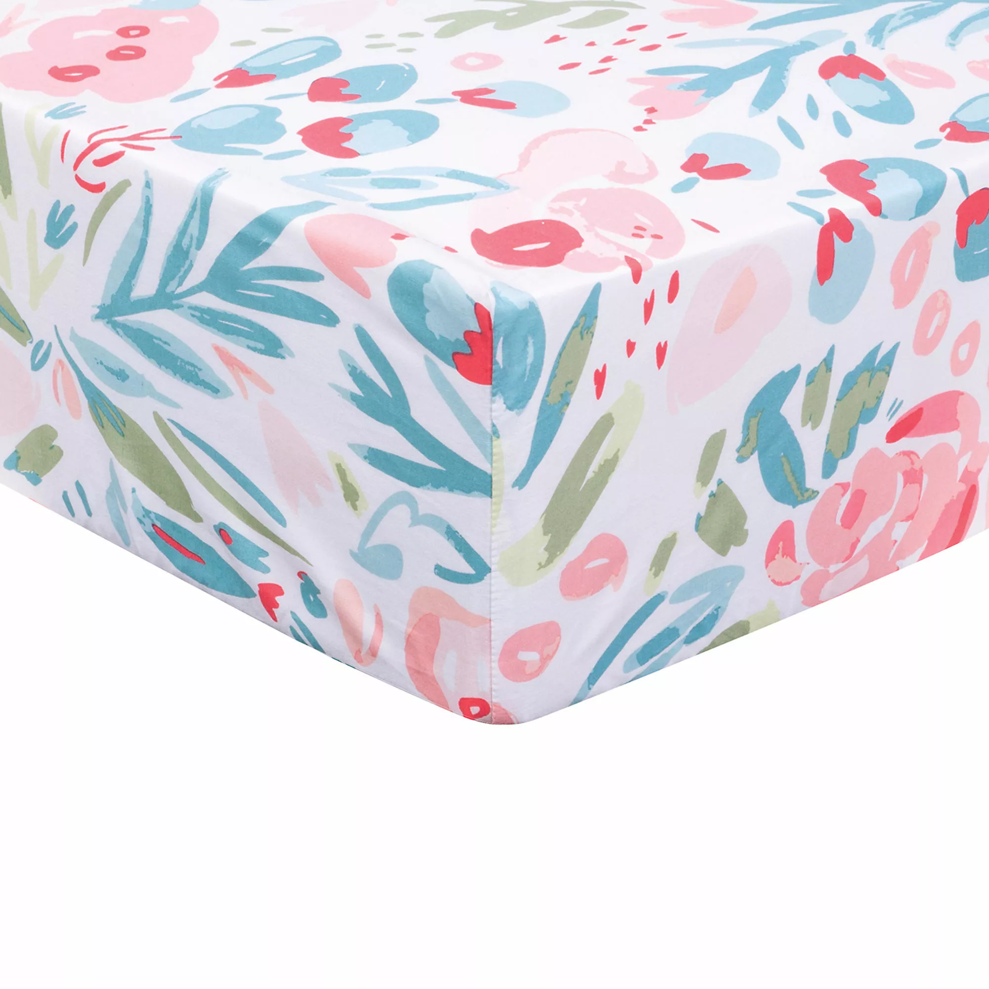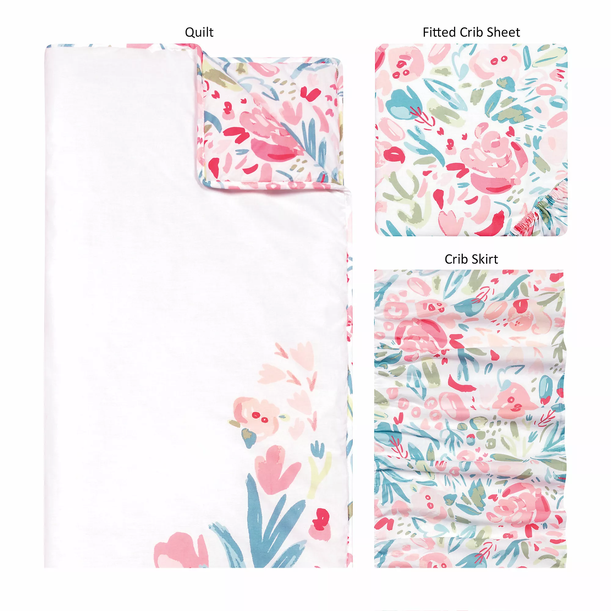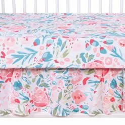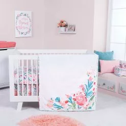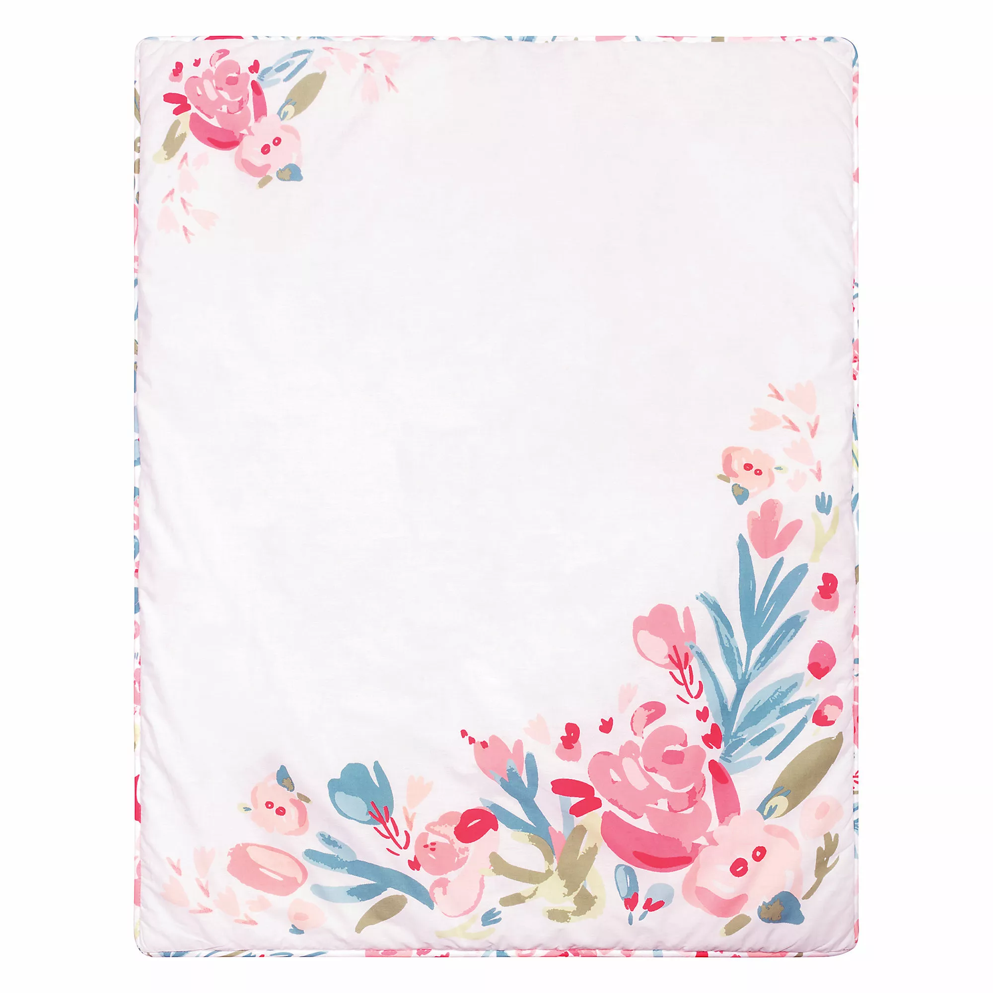 Let your little one drift off to sleep in a bed of roses with the Painterly Floral Collection by Trend Lab. This collection offers the perfect photo opportunity as your baby blossoms and grows with beautiful watercolor florals framing the cotton quilt. The lovely color palette in shades of coral and pink, green, aqua and teal is printed on super soft white brushed cotton and brings beautiful nature to your nursery. Please adhere to JPMA’s Safe Infant Bedding Practices.
