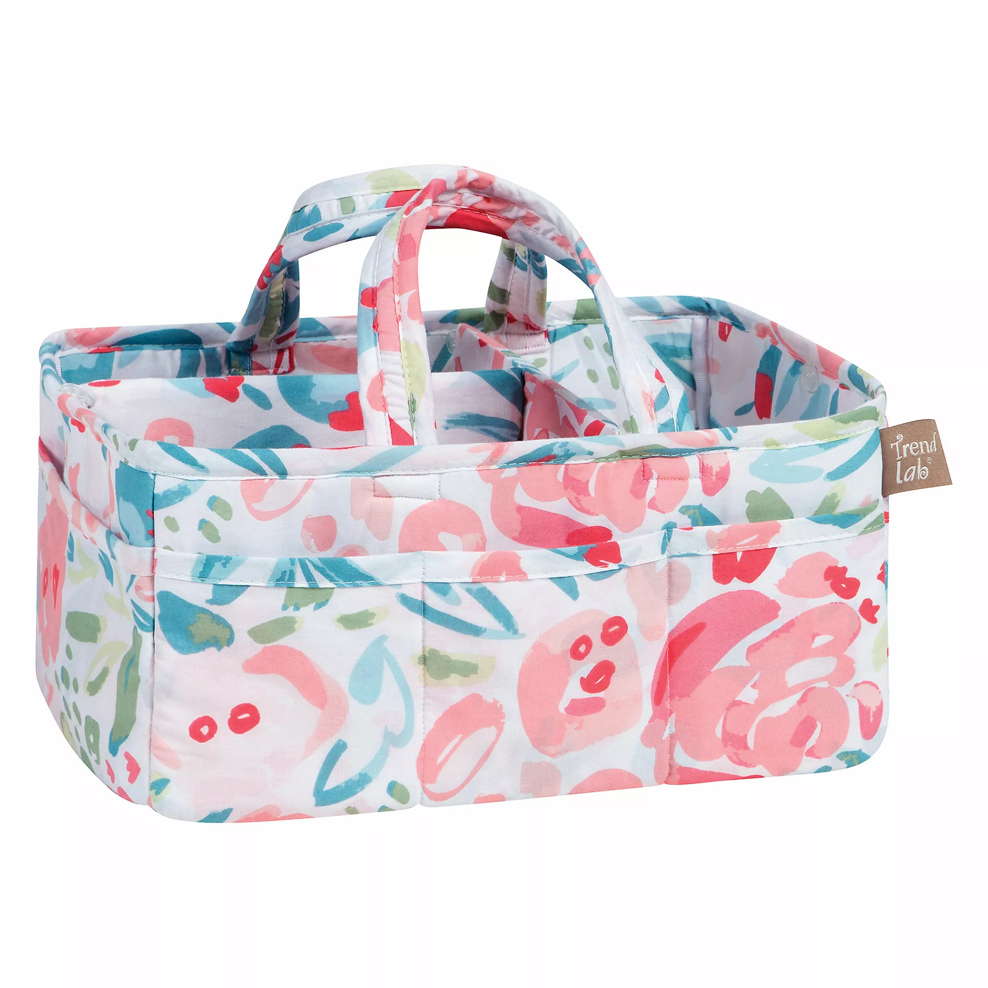 Add organization to any area of your home with the portable Painterly Floral Storage Caddy by Trend Lab. Perfect for dressers and changing stations, this lightly padded caddy has 8 outer pockets and a removable “T” separator for maximum versatility. The body, interior and handles feature a beautiful watercolor floral print in coral, pink, aqua, green and teal. Keep diapers, wipes and other necessities tidy while traveling from room to room. Caddy also functions as an organizer for crafts, picnics, pet supplies, etc.