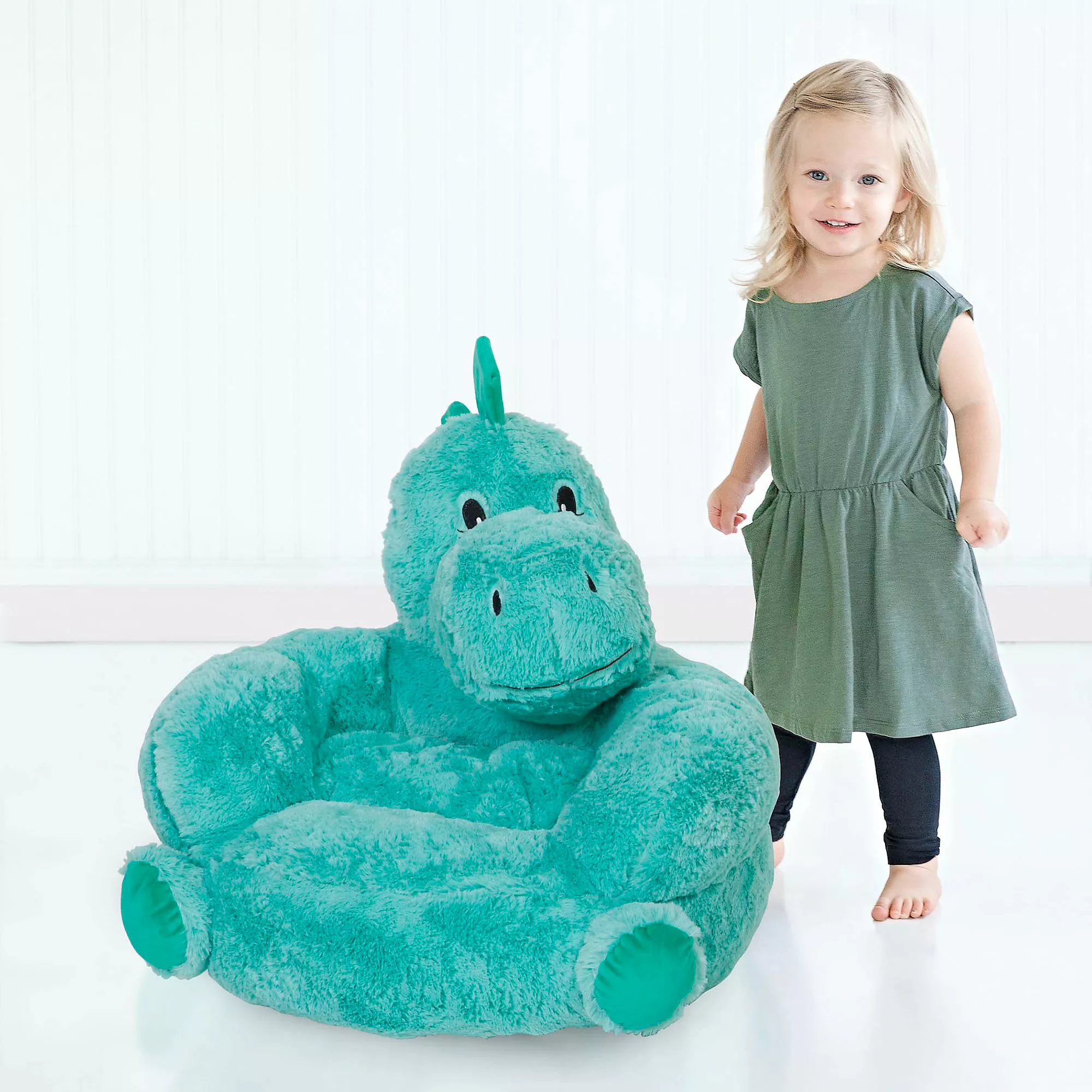 The Trend Lab Toddler Plush Dinosaur Character Chair brings delightful whimsy to your little one’s world and to any room of the house. The Dinosaur Chair is a cuddly companion for reading, relaxing and snuggling thanks to its perfect size, soft green plush “fur” and contoured support. The head is turned to the side to allow your child to rest easily against the animal for maximum cuddling comfort.
