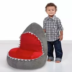 The Trend Lab Toddler Plush Shark Character Chair brings delightful whimsy to your little one’s world and to any room of the house. The Shark Chair is a cuddly companion for reading, relaxing and snuggling thanks to its perfect size, soft plush and contoured support. The shark’s jaw is opened making the top half of the shark head the backrest for your child to rest easily against the animal for maximum cuddling comfort. The Sharks head and fin is soft gray featuring an open jaw with white felt shark teeth and red inside the mouth as the seat rest.