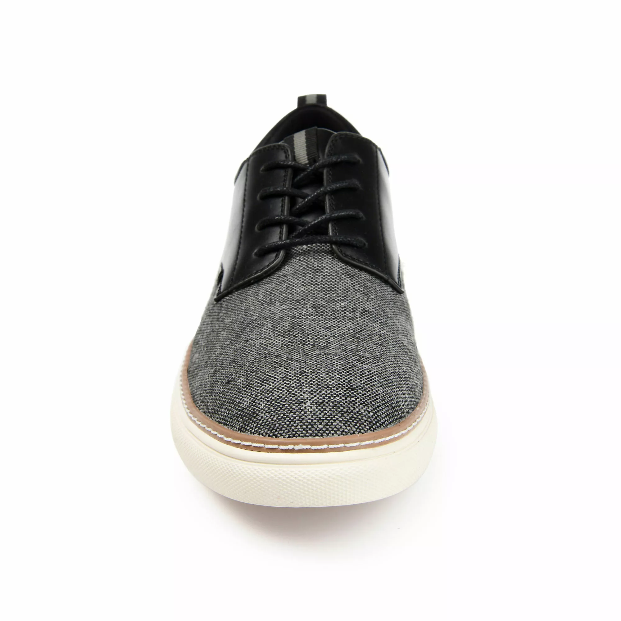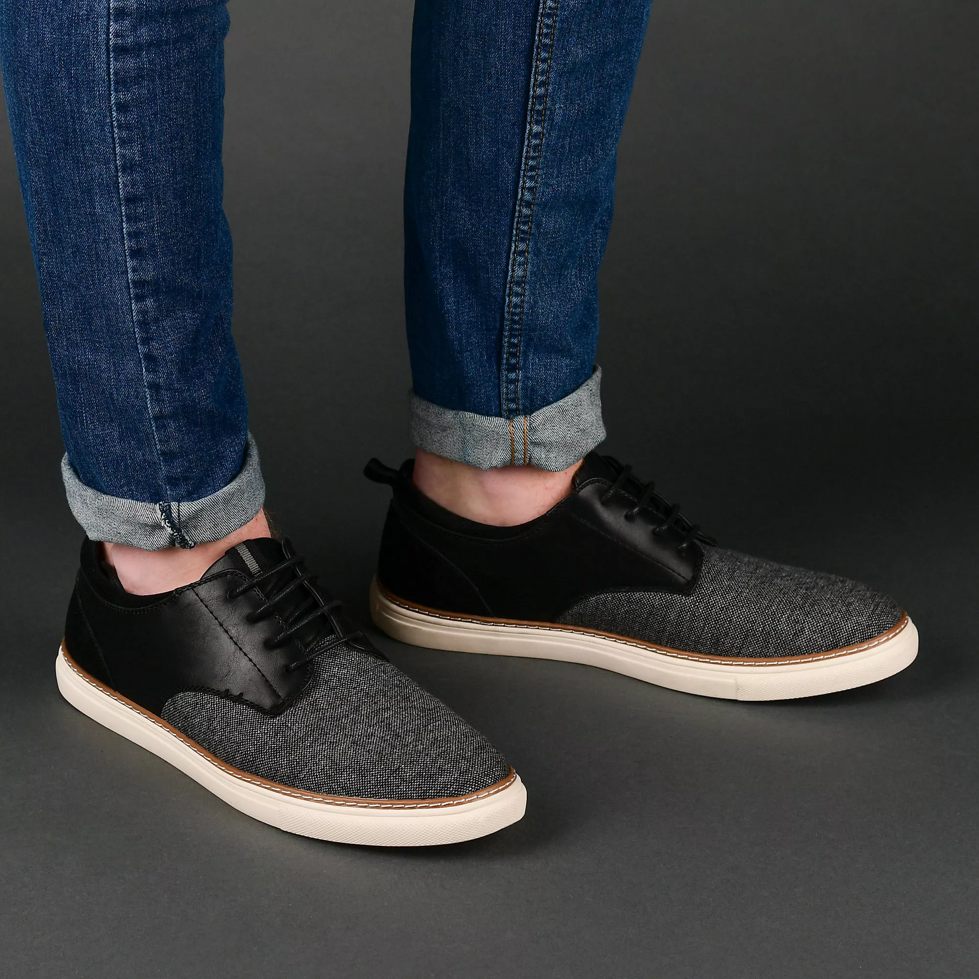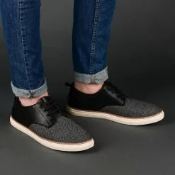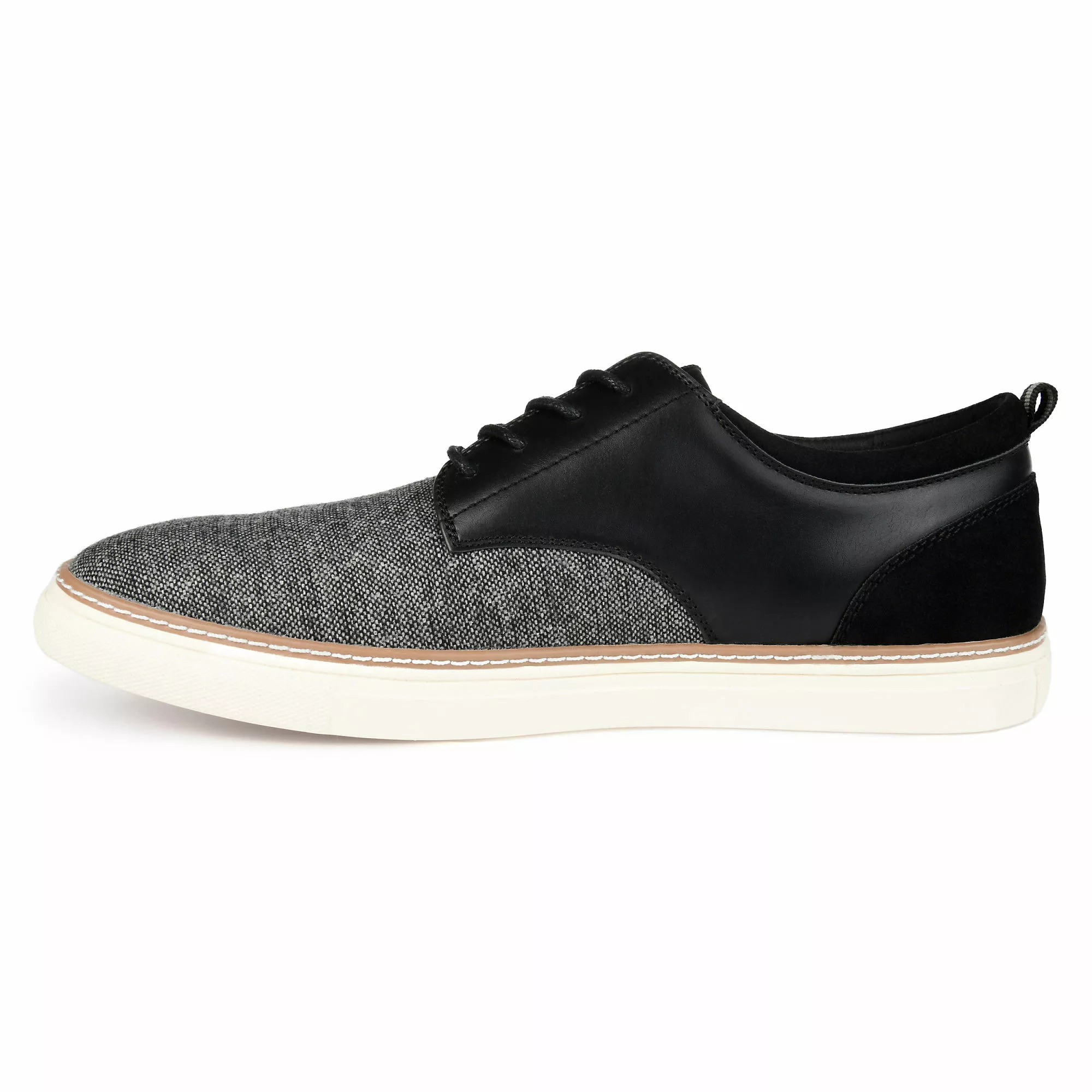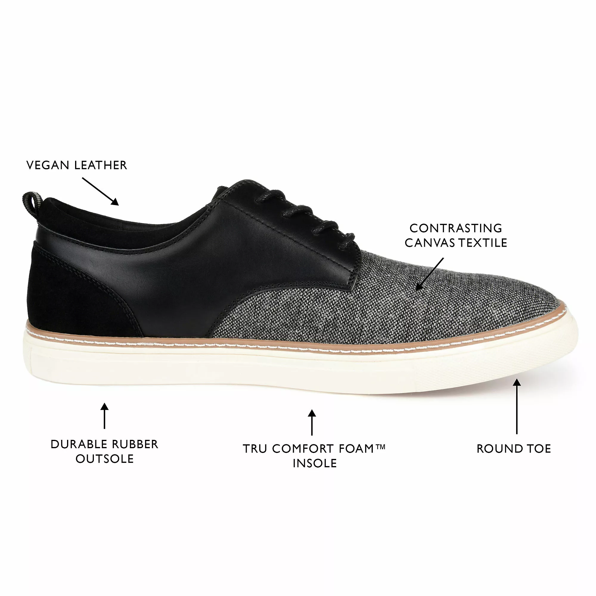 Textured fabrics enhance the retro look of this classic style. The Cooper derby by Vance Co. is cleverly contrasted with premium faux leather accents at the ankle and heel. This lace-up design is thoughtfully finished with a cushioned footbed and a clean rubber sole.