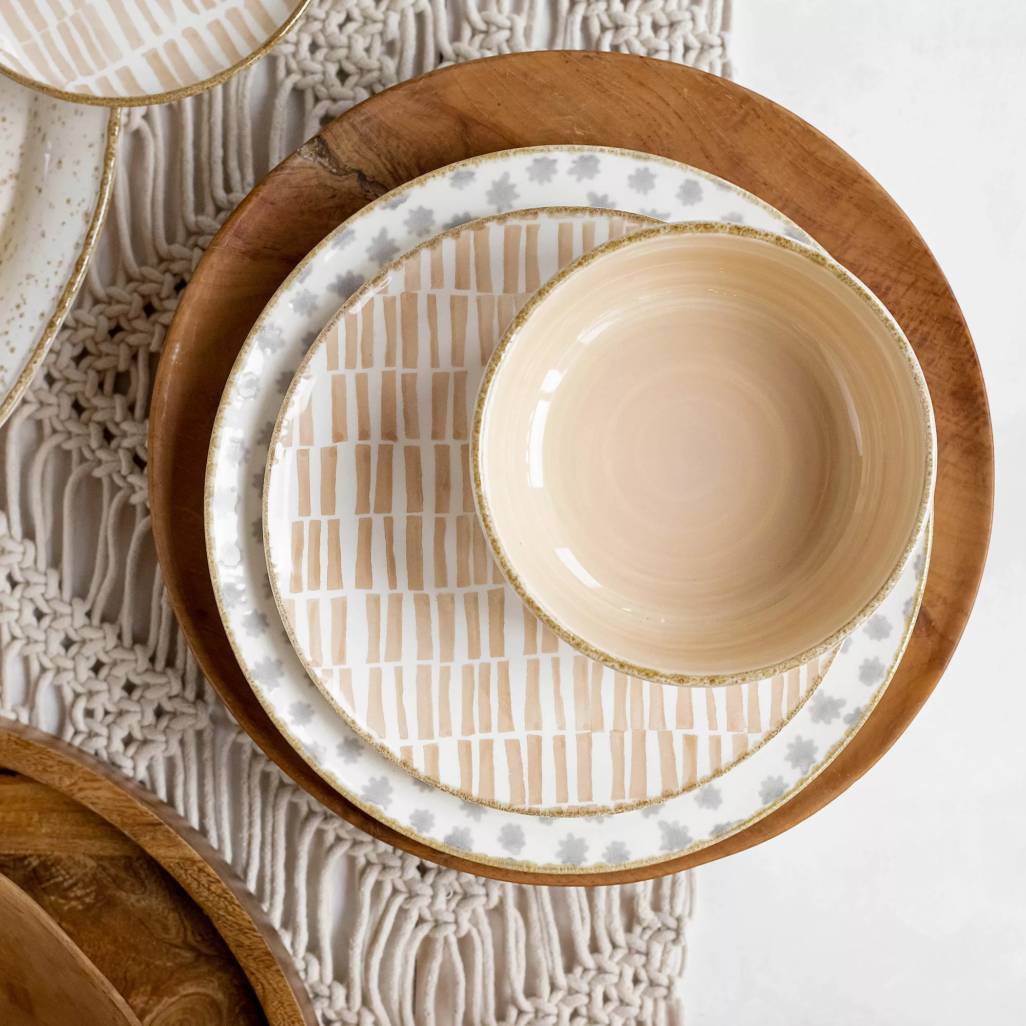 Midcentury modern meets classic chic. Warm neutral tones in four patterns hand painted on hard ceramic in Portugal.