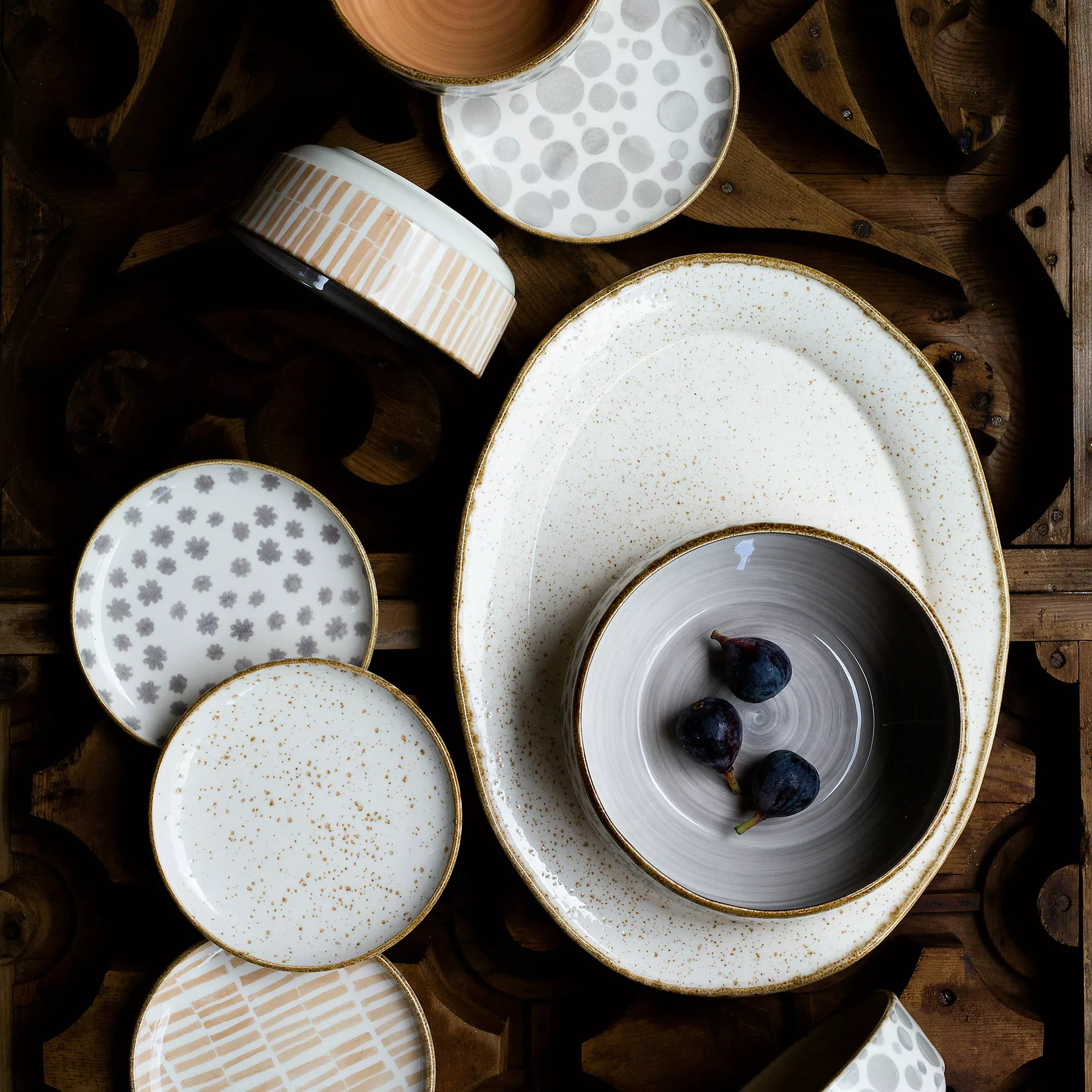 Midcentury modern meets classic chic. Warm neutral tones hand painted on hard ceramic in Portugal.