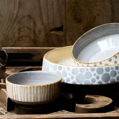 Midcentury modern meets classic chic. Warm neutral tones hand painted on hard ceramic in Portugal.