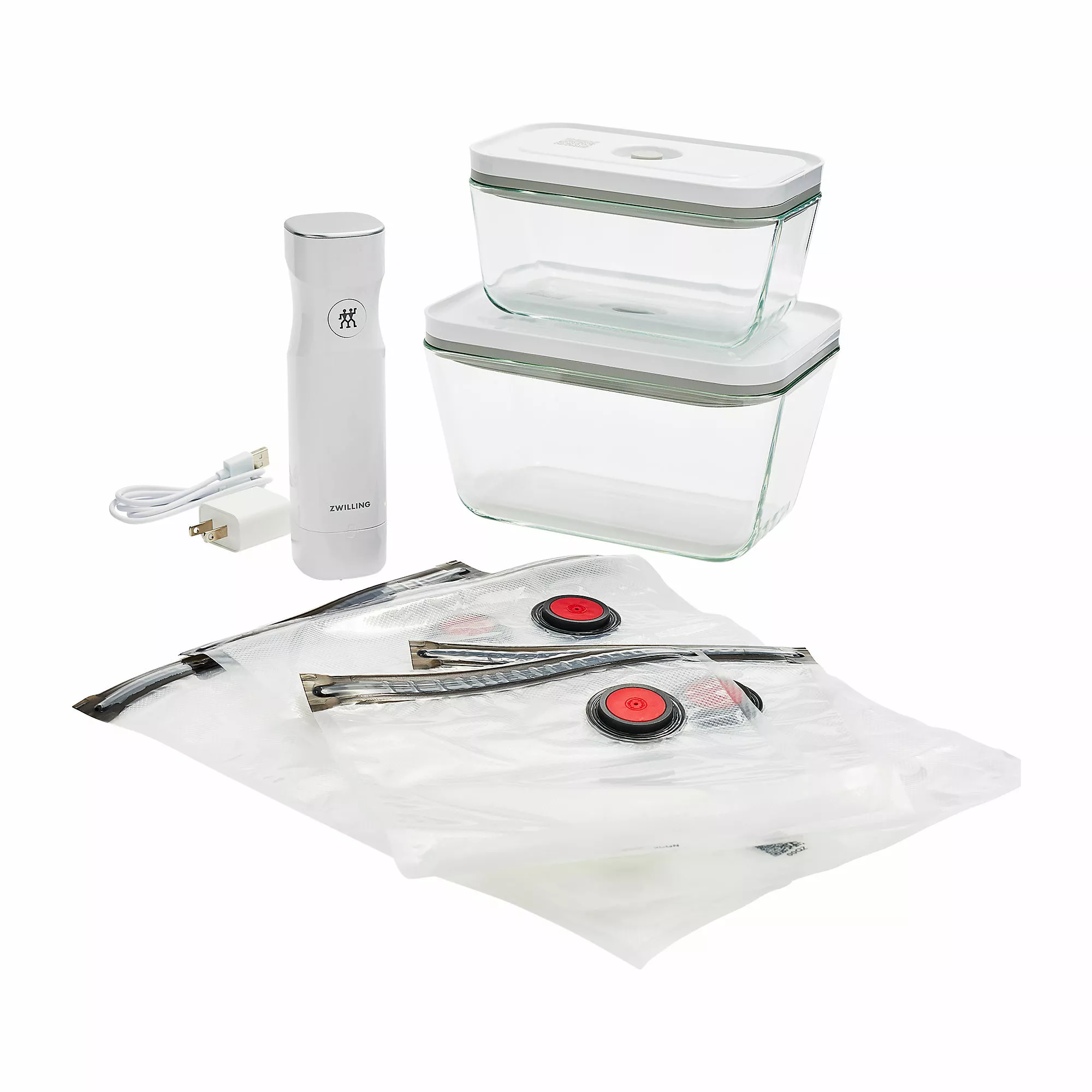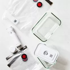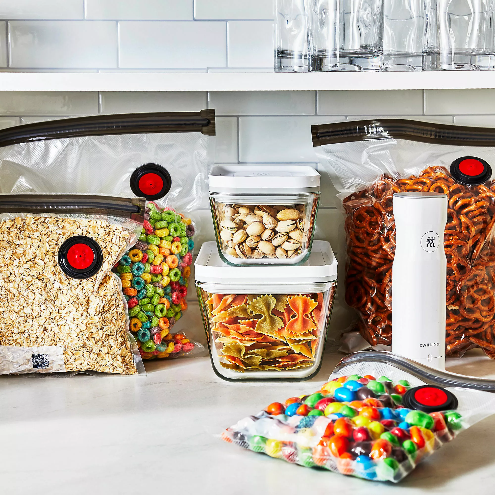 Eat healthier, save time, and store your food with long-lasting freshness with the new vacuum storage system: Fresh & Save. The exclusive Fresh & Save technology preserves flavors and nutrients, prevents freezer burn, and keeps food fresh up to five times longer than non-vacuum storage methods. Blending the power of a countertop vacuum sealer with the versatility of a handheld device, the cordless vacuum pump is fast, quiet, and easy to use. And thanks to its compact design, it will fit into any kitchen. We currently offer two starter sets available with vacuum pump, reusable BPA-free bags that are easy to close with a zipper attachment and are ideal for sous-vide cooking and microwave reheating, and either borosilicate glass or BPA-free polypropylene plastic containers. With the ZWILLING double sealing effect (most others only seal one surface) the containers shut tightly for super-fresh food. What’s more? The downloadable Culinary World app will track when you store food and when it will spoil, helping you to reduce food waste and save money. For a smart way to store food, choose Fresh & Save.